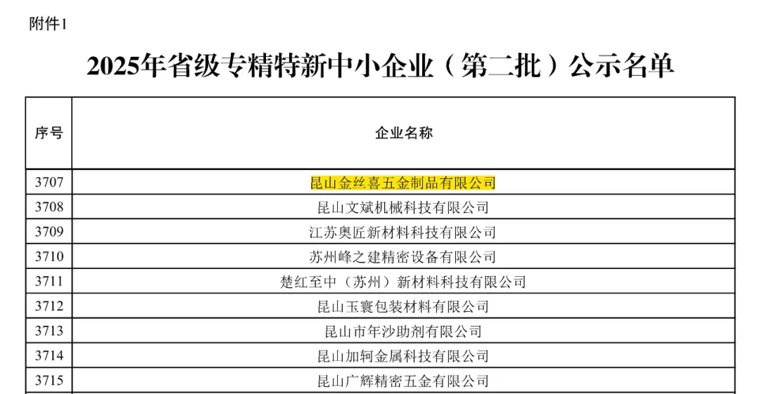 Slovenski Πρόσφατα, το Επαρχιακό Τμήμα Βιομηχανίας και Τεχνολογίας της Πληροφορικής της Jiangsu ανακοίνωσε επίσημα την τελευταία παρτίδα εξειδικευμένων και εξελιγμένων ΜΜΕ της Jiangsu που αναγνωρίστηκαν για το 2025. Η Kunshan Jinsixi Metalware Co., Ltd. επιλέχθηκε με επιτυχία και απονεμήθηκε ο τίτλος των «Jiangsu Specialized and Sophisticated SMEs» λόγω της άριστης ποιότητας καινοτομίας, της άριστης τεχνικής και γρήγορης συσσώρευσης προϊόντων.